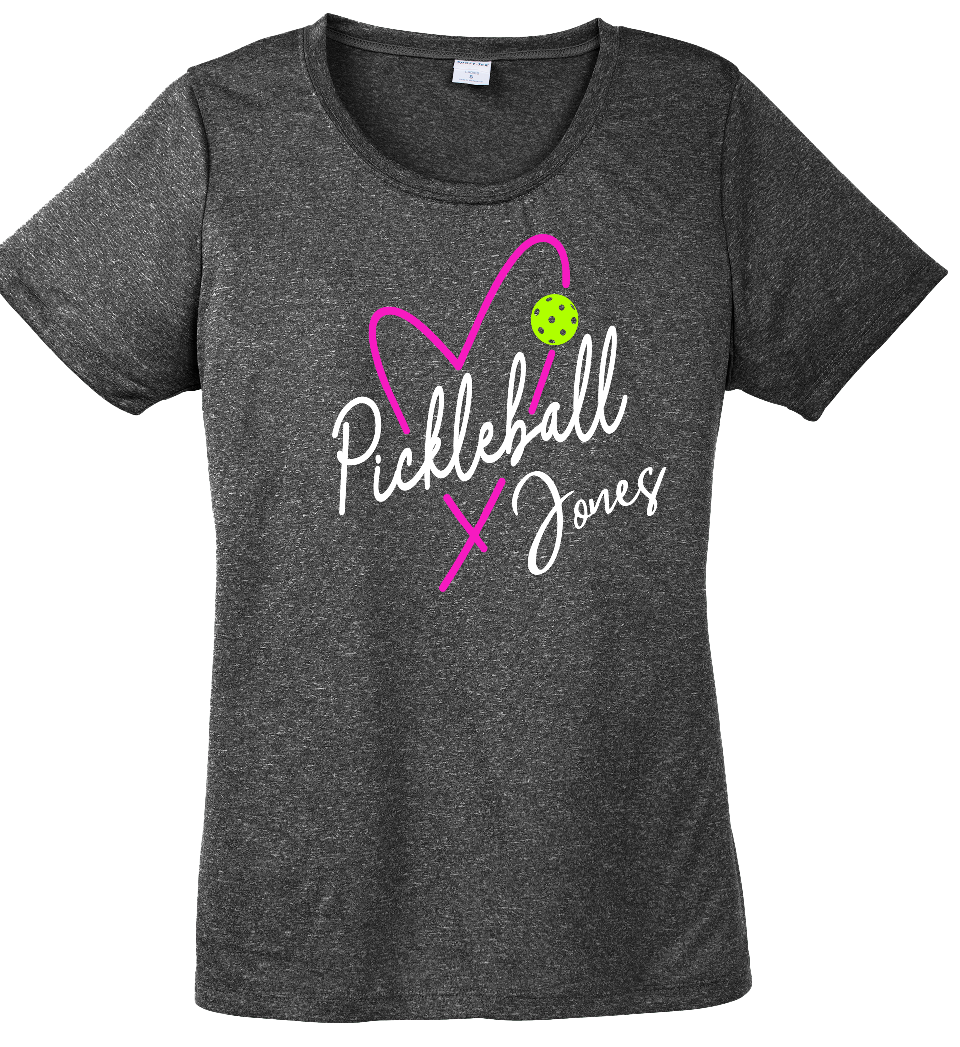 Ladies Short Sleeve Scoop Neck Graphite Heathered Tee with Pink, White, and Neon Green Pickleball Jones Heart Design